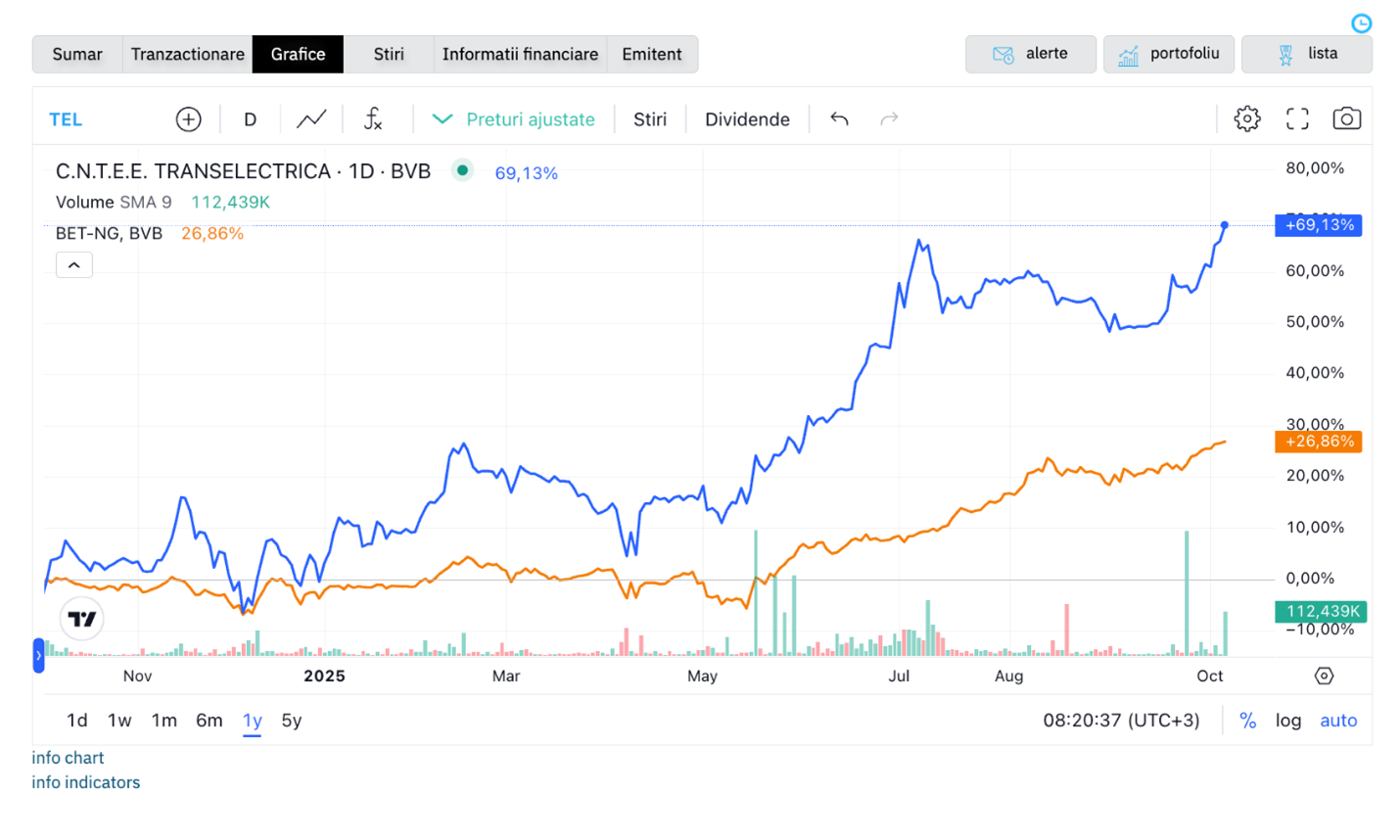 Cu o apreciere de peste 70% în acest an, acțiunile Transelectrica se numară printre performerii BVB, contribuind semnificativ la evoluția foarte bună a sectorului de utilități, titlurile TEL tranzacționându-se în zona maximelor istorice, conform analiștilor.