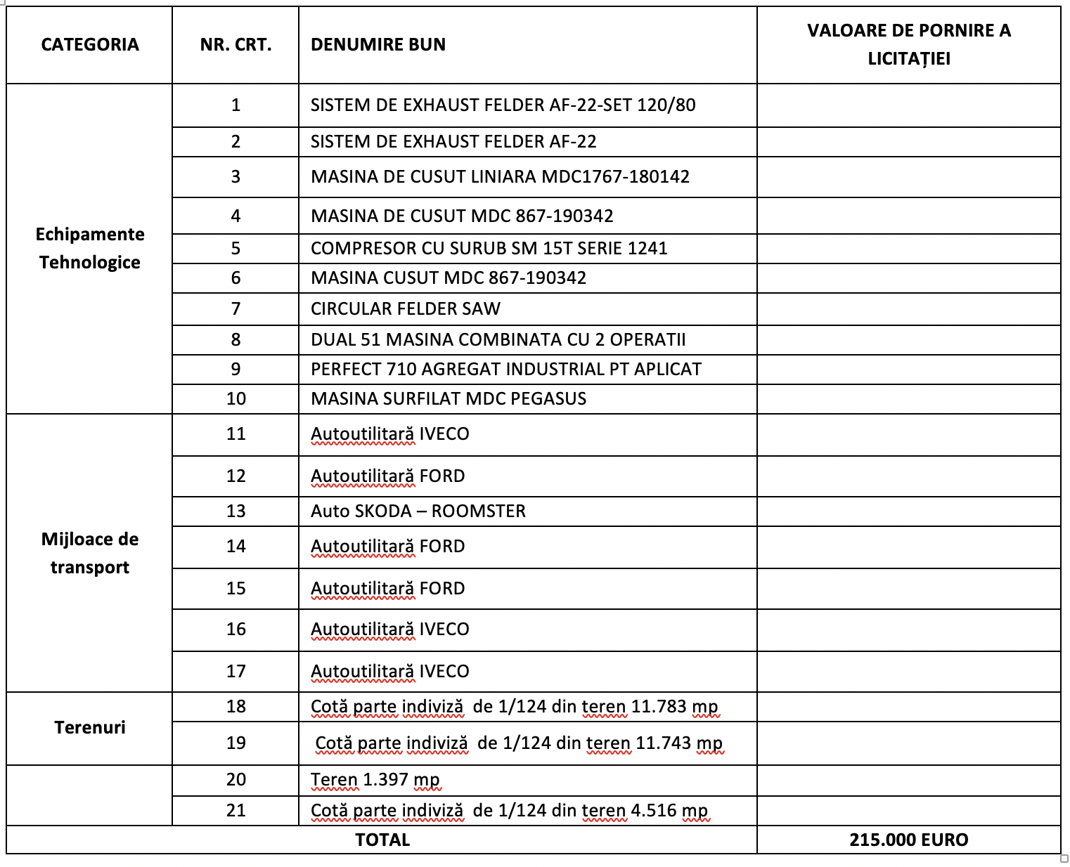 Se vor organiza licitatii publice cu strigare, prin metoda licitatiei competitive. Vânzarea se face doar în bloc. Persoanele interesate sa participe la licitatie vor depune scrisoarea de intentie si documentele mentionate in caietul de sarcini pana cel tarziu in preziua licitatiei orele 16:00, (in zilele de luni) la sediul administratorului judiciar din Str. Slt. Dima Cristescu, nr. 3B, et. 1, ap. 5, Sector 2, București sau prin e-mail office@fairrevive.ro cu respectarea prevederilor caietului de sarcini.