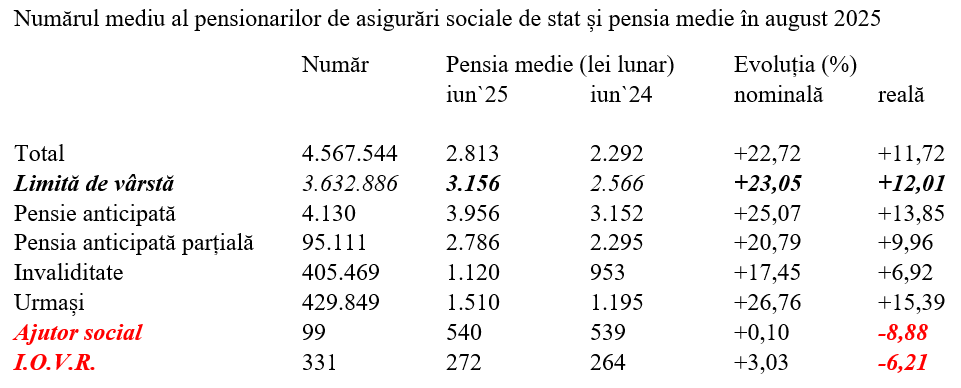 Pensia medie pentru limită de vârstă a fost în luna august 2025 de 3.158 lei în cazul asigurărilor sociale de stat, potrivit datelor comunicate de Casa Națională de Pensii Publice (CNPP). Reamintim că indexarea de început de an nu s-a mai făcut, urmare a necesității de ajustare a deficitului bugetar și a creșterii datoriei publice.