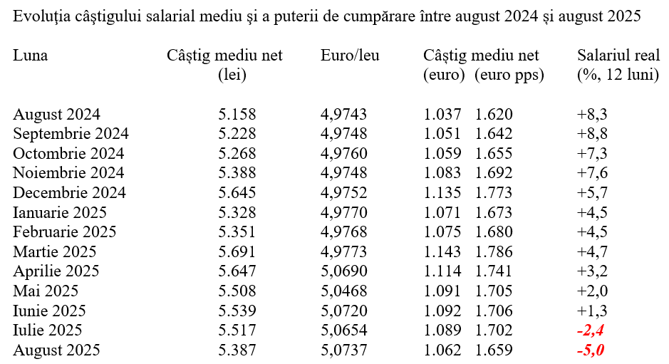 Pe fondul ameliorării marginale a cursului euro/leu, puterea de cumpărare echivalentă a salariului mediu a scăzut la 1.659 euro (prețuri relative în România de 64%, calculate de Eurostat și publicate în iunie 2025). Este cea mai mică valoare din ultimele zece luni. Cu referința octombrie 1990 (ultima lună înaintea liberalizării prețurilor), salariul real s-a redus în august cu 10,8 puncte procentuale, până la 236,4%.