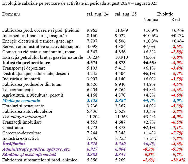 De reținut adâncirea în domeniul negativ ca putere de cumpărare de -6% a sectorului IT (de la -4,4% anterior) și nivelul în declin și mai pronunțat (-7,1%) din domeniul construcțiilor, în pofida contribuției acestuia din urmă la creșterea economică, respectiv +0,3 puncte procentuale la un rezultat PIB pe S1 2025 de exact +0,3%).