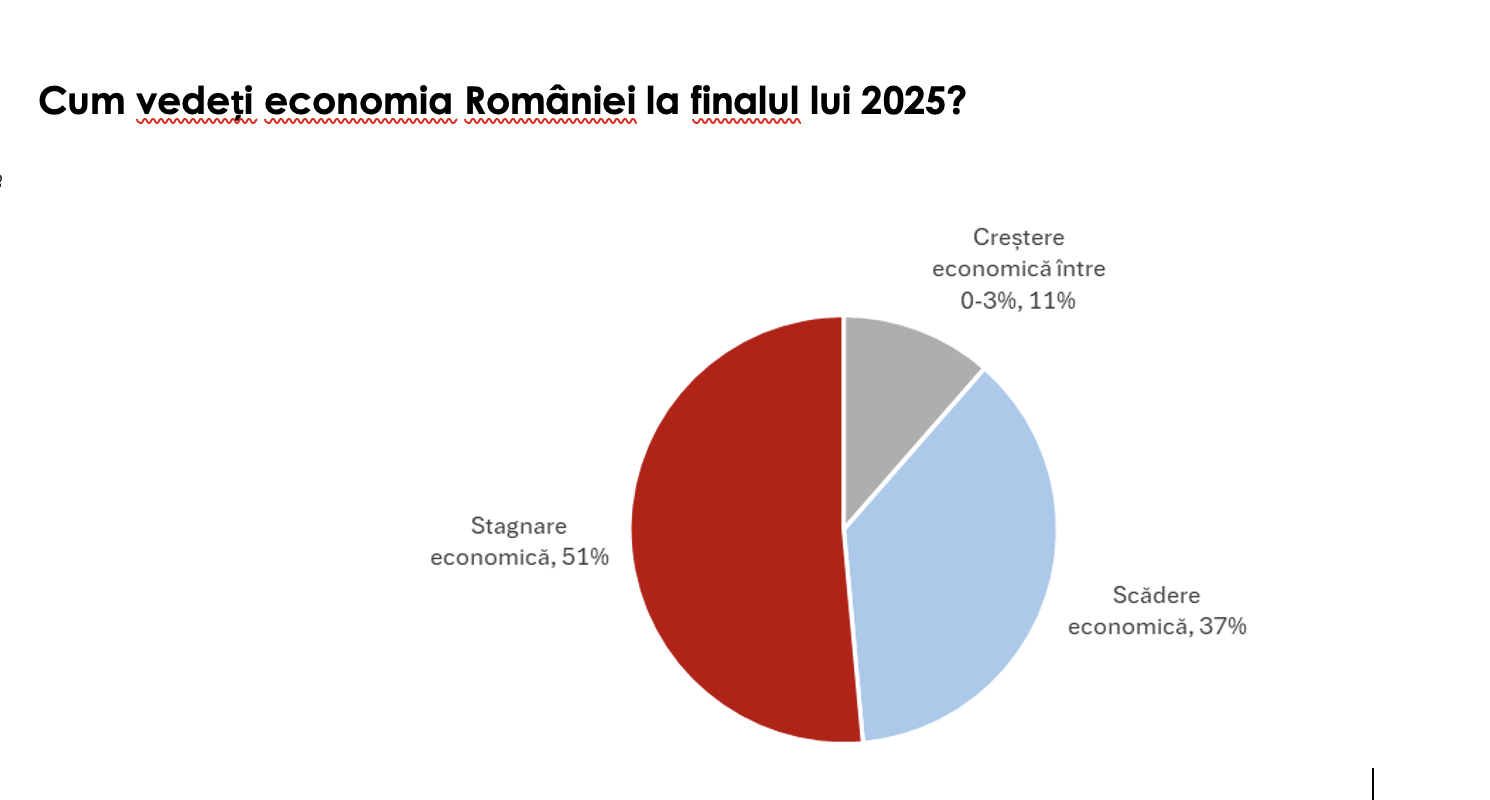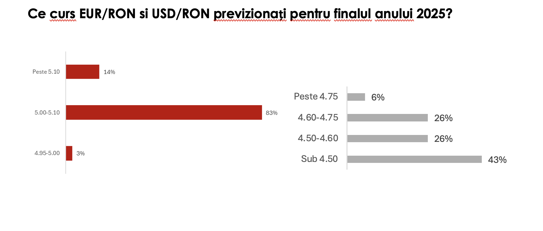 În ceea ce privește așteptările pentru 2025, 68% dintre trezorieri estimează o creștere a cifrei de afaceri pentru companiile în care lucrează, în general sub 25%. Scorul mediu acordat economiei românești este de 5,69 din 10. Majoritatea participanților anticipează un curs EUR/RON între 5,00 și 5,10, respectiv un USD/RON sub 4,60.