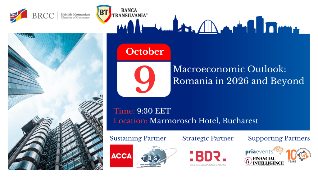 The British Romanian Chamber of Commerce (BRCC), in partnership with Banca Transilvania, announce the 4th edition of its flagship annual conference focused on Romania’s macroeconomic trajectory. The event will take place on October 9, 2025, at 9:30 AM, hosted at the Marmorosch Hotel in Bucharest.
