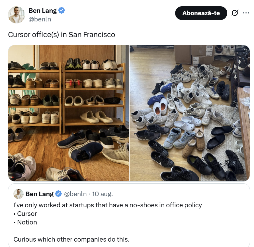 Ben Lang, un angajat al Cursor care s-a alăturat la începutul acestui an startup-ului de codare AI în valoare de 9,9 miliarde de dolari, a postat, recent, două fotografii pe X în care se vedeau rafturi pline cu pantofi, plus adidași și pantofi fără șireturi împrăștiați pe podea. Destinația nu era casa cuiva, ci biroul Cursor din San Francisco, care are o politică de interzicere a pantofilor, scrie Entrepreneur.