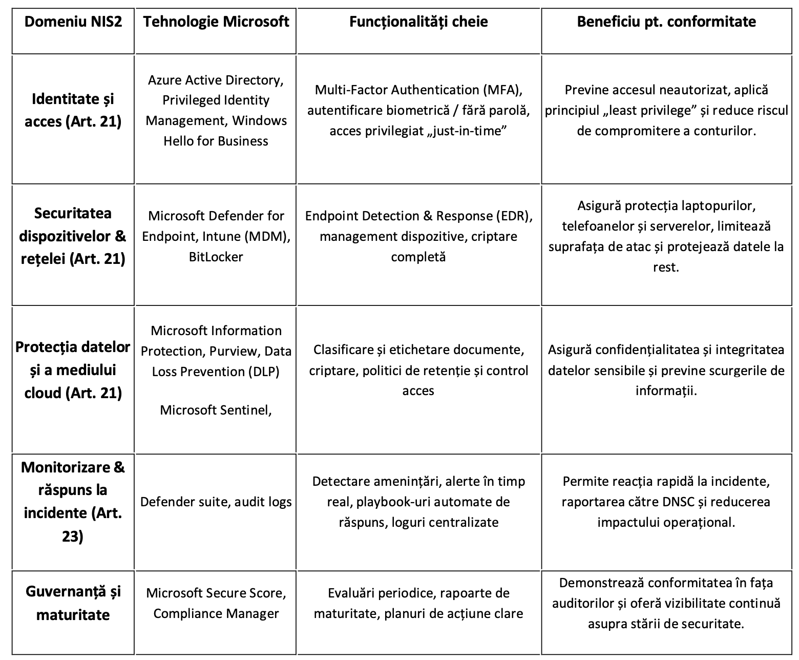 Directiva NIS2 nu un simplu set de recomandări, ci o listă clară de obligații. Optimizor acoperă o parte semnificativă din aceste cerințe prin tehnologii Microsoft 365 configurate și adaptate pentru fiecare client: