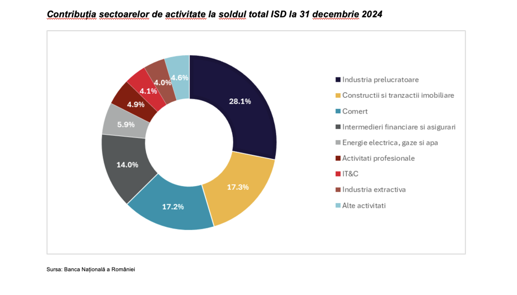 În intervalul 2014 – 2024, cele patru sectoare care dețin ponderea majoritară în soldul total net al investițiilor străine directe au avut un ritm de creștere diferit. Astfel, în timp ce industria a consemnat o creștere de numai 54,4% față de nivelul anului 2014 (+16,3 miliarde de euro), în comerț (+14,8 miliarde de euro) plus construcții și tranzacții imobiliare (+15,1 miliarde de euro) s-au înregistrat triplări ale soldurilor, iar în intermedieri financiare și asigurări o creștere de 123% (+ 9,6 miliarde de euro).
