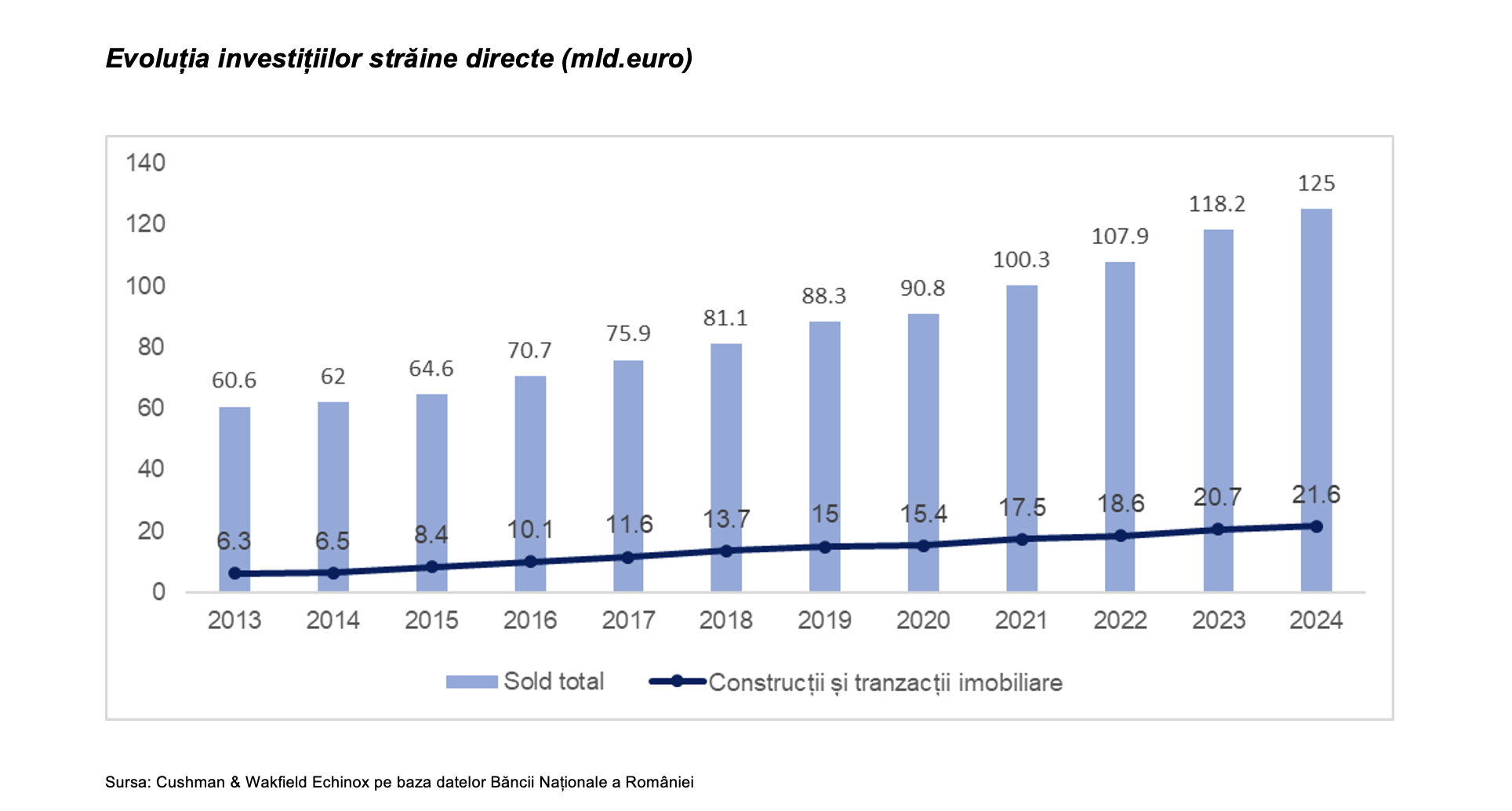 Investițiile străine directe din construcții și tranzacții imobiliare s-au majorat de peste trei ori în valoare absolută în perioada 2014 – 2024, respectiv cu 15,1 miliarde euro, ajungând la 21,6 miliarde euro la finalul anului trecut, astfel că ponderea acestui sector în soldul total a crescut de la 10,6% la 17,3%, conform datelor Băncii Naționale a României analizate de compania de consultanță imobiliară Cushman & Wakefield Echinox.
