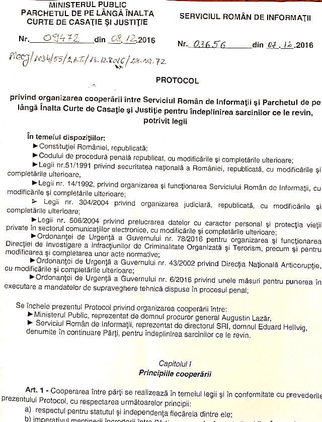Acest protocol a fost încheiat în 07.12.2016, chiar înaintea alegerilor parlamentare. El a fost semnat de procurorul general Augustin Lazăr și actualul director al SRI, Eduard Hellvig.