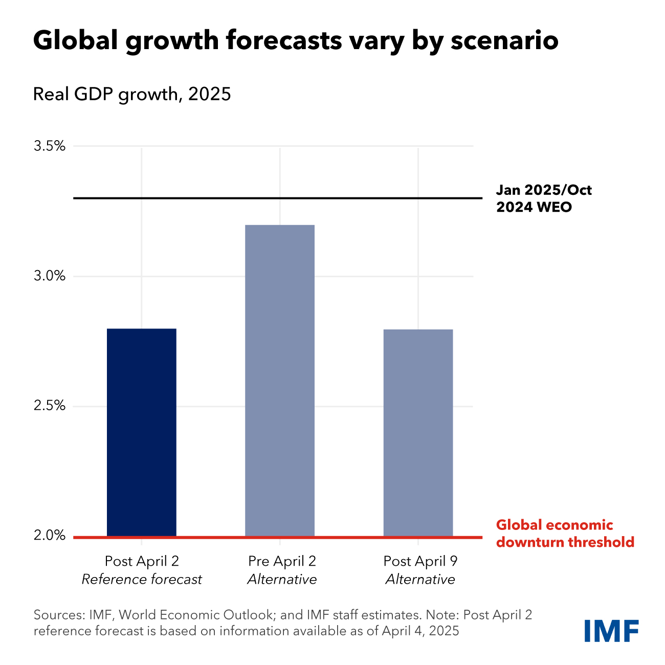 Previziunile de referință ale World Economic Outlook includ anunțurile tarifare făcute de SUA între 1 februarie și 4 aprilie și contramăsurile luate de alte țări. Acest lucru reduce prognoza noastră de creștere globală la 2,8 % și 3 % în acest an și anul viitor, o reducere cumulată de aproximativ 0,8 puncte procentuale în raport cu actualizarea WEO din ianuarie 2025. De asemenea, prezentăm o previziune globală care exclude tarifele din aprilie (previziunea anterioară datei de 2 aprilie). Conform acestei traiectorii alternative, creșterea globală ar fi înregistrat doar o scădere cumulată modestă de 0,2 puncte procentuale, la 3,2% pentru 2025 și 2026.