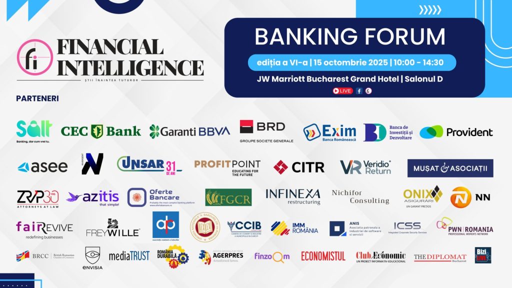 Financial Intelligence organizează miercuri, 15 octombrie 2025, de la ora 10:00, cea de-a șasea ediție a evenimentului BANKING FORUM, la JW Marriott Bucharest Grand Hotel. Evenimentul va putea fi urmărit și online, LIVE, pe www.financialintelligence.ro, pe pagina de Facebook Financial Intelligence și pe canalul de Youtube Financial Intelligence.