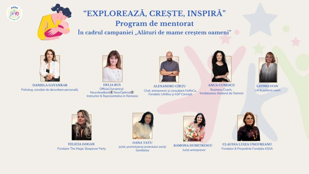 Fundația ASSA lansează Programul Național de Mentorat „Explorează, crește, inspiră!”, este un proiect special inițiat de Claudia Ungureanu, fondator&Președinte al Fundației ASSA, în parteneriat cu Daniela GavankarPsiholog, consilier de dezvoltare personală, profesor universitar asociat al Universității Spiru Haret și Delia Rusconsilier de dezvoltare personală și Instructor certificat  Neuroptimal ® în România, care vor fi și mentori permanenți ai programului.