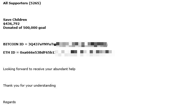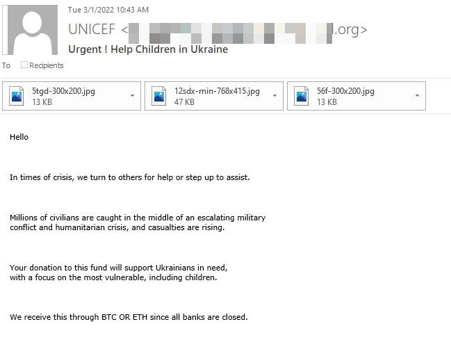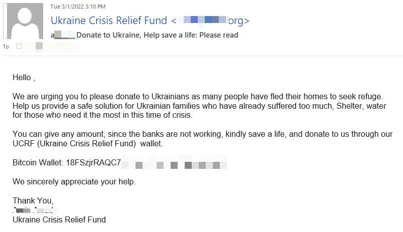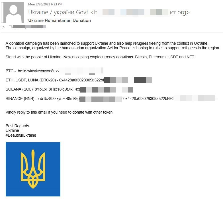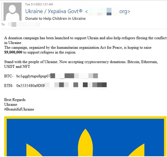 O anumită campanie, care folosea ca subiect „Fiți alături de poporul ucrainean. Acceptăm acum donații în criptomonede. Bitcoin, Ethereum și USDT”, provenind de la adrese IP din China, a ajuns la zeci de mii de căsuțe de e-mail pe 2 martie. 25% dintre e-mailurile înșelătoare au fost direcționate către utilizatori din Marea Britanie, 14% din SUA, iar unul din 25 de mesaje a vizat ținte din România.
