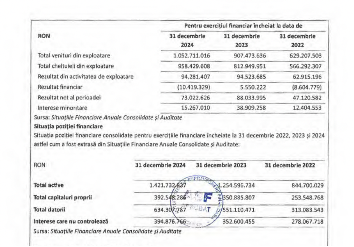 Emitentul a înregistrat un profit net de 73 milioane de lei, în 2024, în scădere cu 17% față de 2023, pe fondul unor venituri din exploatare de 1,05 miliarde lei, anul trecut, în creștere cu 15%.
