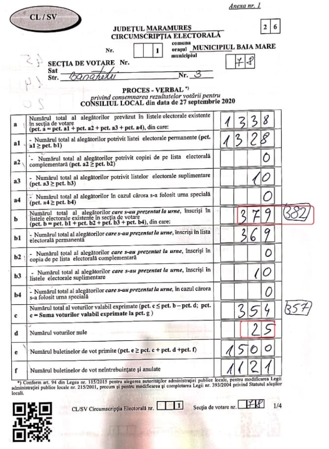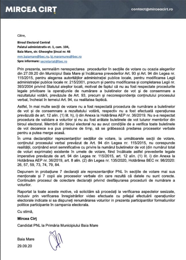 “La alegerile din 27 septembrie pentru funcția de primar al municipiului Baia Mare, la multe secții de votare s-au petrecut mari nereguli, legate de nerespectarea procedurilor legale privind numărătoarea buletinelor de vot și consemnarea rezultatului votării (art. 94 din Legea215/2001), respectiv neconcordanța conținutului proceselor verbale cu realitatea faptică (art.94 din legea invocată). Pare că sună a generalități cârcotașe, până veți privi câteva procese verbale anexate (o parte doar din dovezi), care arată mai rău decât tema la aritmetică a unui elev de clasa a patra. Veți mai vedea că, din pix, numărul alegătorilor crește cu… 100(!), de la 631 la 731, cu explicația eliptică ”adunat din interior”; sau cum e posibil ca din 380 de voturi, 25 să fie declarate nule, a scris Mircea Cirț, candidatul PNL Maramureș pentru Primăria Municipiului Baia Mare, pe pagina sa de Facebook.