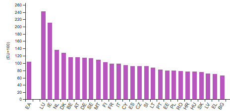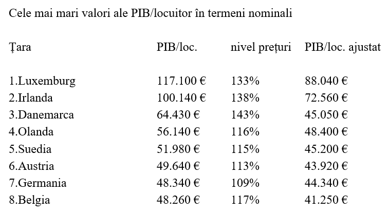 Pentru referință, merită prezentată și situația din partea de sus a clasamentului PIB/loc., unde Luxemburg și Irlanda beneficiază statistic de raportarea unor valori artificial mai mari ale rezultatului economic din motive diferite (în primul caz, activitatea amplificată de angajații rezidenți în țările vecine se raportează la numărul de localnici iar în al doilea ca efect al Brexitului, care a mutat sediile unor importante multinaționale).