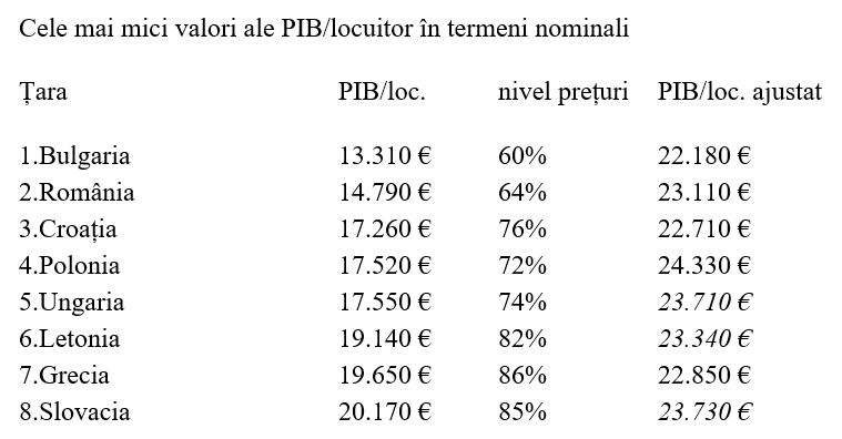Astfel, pe datele disponibile la zi (desigur operative și aproximative), au revenit de puțin înaintea noastră (România ar avea echivalentul a 23.110 € pe locuitor), Letonia (23.340 €), Ungaria (23.710 €) și Slovacia (23.730 €) iar Grecia (22.850 €, după o revenire din criză) și Croația (22.710 €) s-au apropiat la mică distanță.