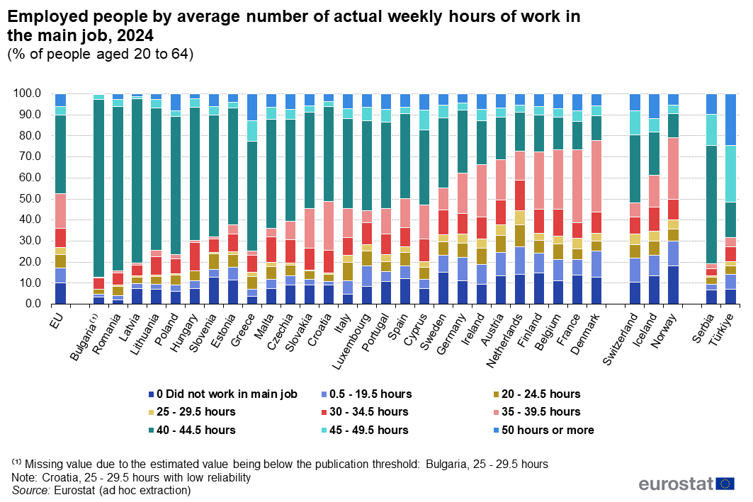 La polul opus, regăsim economii occidentale dezvoltate precum Olanda (32,1 ore), Austria, Germania și Danemarca (toate cu 33,9 ore), în timp ce media Uniunii Europene se ridică la 36 de ore. 37,3% dintre angajații europeni au lucrat săptămânal între 40 și 44,5 ore și doar 7,2% au contabilizat mai puțin de 20 de ore.