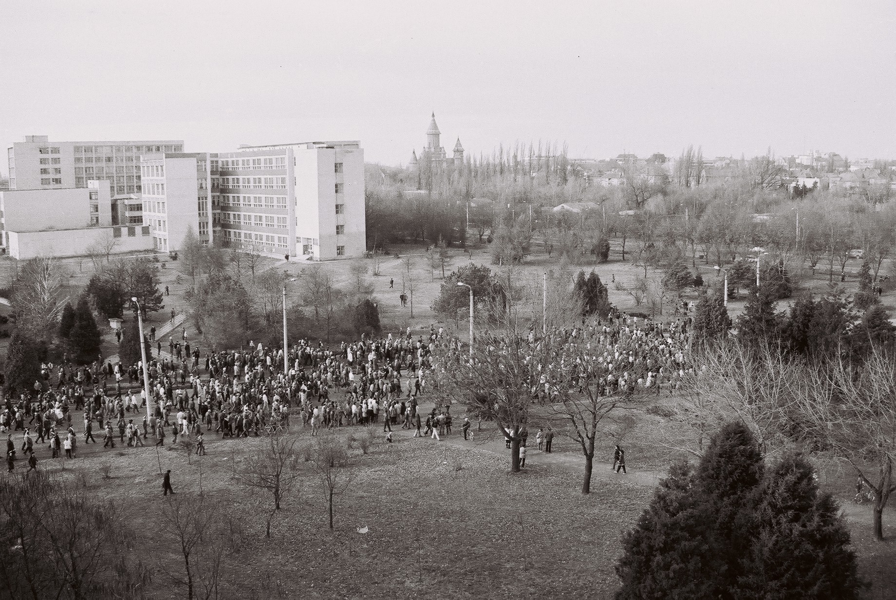 La 16 decembrie 1989, mai mulţi credincioşi din oraş demonstrau paşnic, în jurul Catedralei reformate din Piaţa Maria, faţă de o decizie judecătorească prin care pastorul reformat László Tokés urma să fie evacuat şi mutat în altă localitate. Mişcarea avea să se extindă, la aceasta aderând studenţi, muncitori şi alţi locuitori ai Timişoarei. Se formează coloane de timişoreni care se îndreaptă către centrul oraşului. Izbucneşte, astfel, o revoltă anticomunistă pe fondul scăderii dramatice a nivelului de trai al populaţiei, ca şi al destrămării sistemului comunist european în fostele ţări socialiste, menţionează lucrarea “Istoria României în date” (Ed. Enciclopedică, 2003).